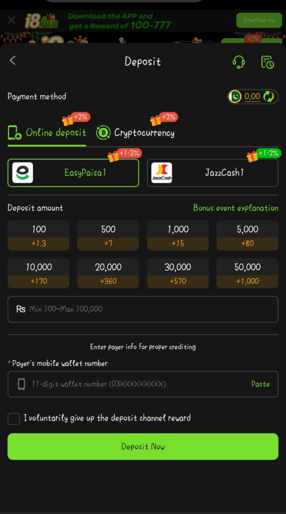 The i8Fun Game supports local wallets such as JazzCash and EasyPaisa, making deposits and withdrawals familiar and convenient for Pakistani users. These payment methods are widely trusted and reduce the need for international transactions. The app also claims to secure user data through encryption and protect transactions. However, players should still safeguard account information, use strong passwords, and avoid sharing personal credentials. Basic customer support is available in the app to assist with account issues, payment queries, and technical problems, providing a safer and more reliable experience for users.